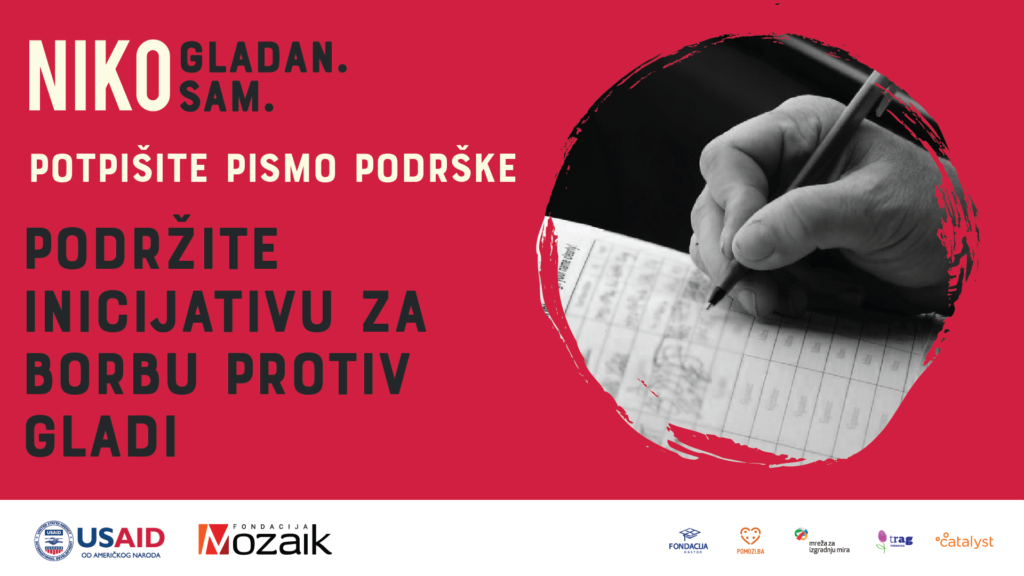 Cilj inicijative “Niko gladan. Niko sam”, koju provodi Fondacija Mozaik sa Fondacijom Hastor, Udruženjem Pomozi.ba, Mrežom za izgradnju mira, te fondacijama Trag i Catalyst Balkans, uz finansijsku podršku USAID-a, jeste da se dio donacija u hrani oslobodi od plaćanja PDV-a.