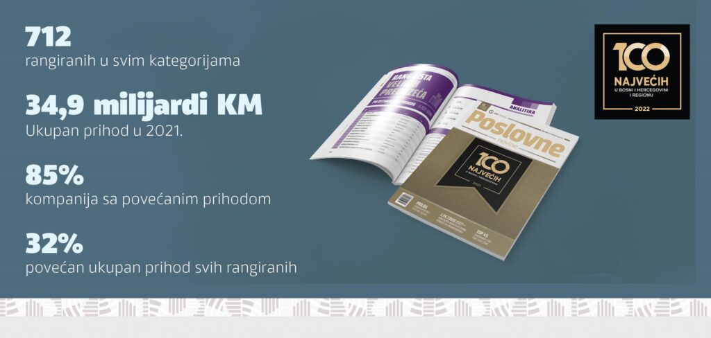 Od 712 ukupno rangiranih kompanija prema različitim kriterijima i kategorijama, na ljestvicama „100 najvećih u BiH“ njih 607 je imalo veće prihode u 2021. u poređenju s 2020. godinom. Pokazala je to analiza koju je uradila bonitetna agencija LRC BIS za Poslovne novine i potrebe projekta „100 najvećih u BiH i regionu“, koji se ove godine realizuje po 35. put.