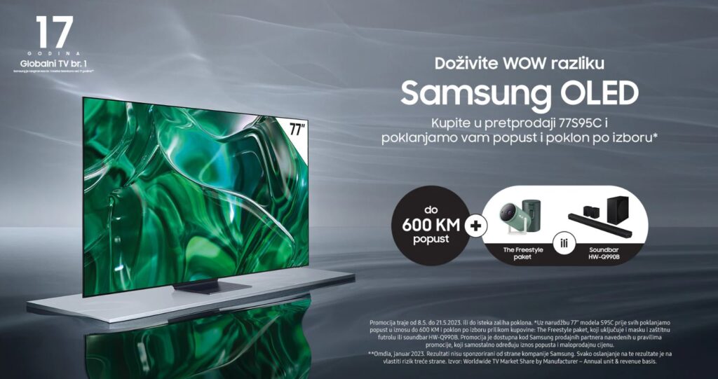 Kompanija Samsung bosanskohercegovačkom tržištu predstavlja novu dimenziju u oblasti OLED televizora i pripremila je posebnu ponudu u periodu prednarudžbi. Kod prednarudžbi novog Samsung OLED 77 ” TV modela, Samsung vam daje popust od 600 KM i poklon po vašem izboru. Možete birati između The Freestyle paketa koji uključuje The Freestyle prenosni projektor, masku i zaštitnu futrolu ili Soundbar HW-Q990B zvučnika.