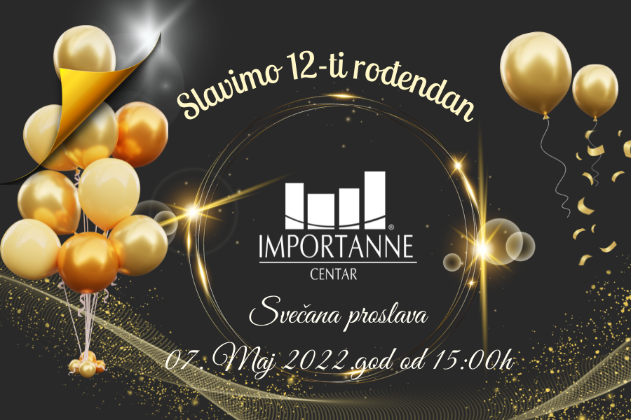 Importanne centar 06.05.2022. godine obilježava svoj 12-ti rođendan za sve posjetitelje pa je tim povodom pripremljena i svečana proslava sa veoma bogatim programom u Subotu 07.05.2022.god od 15:00 h na koju ste svi pozvani.