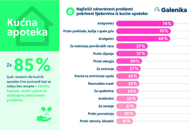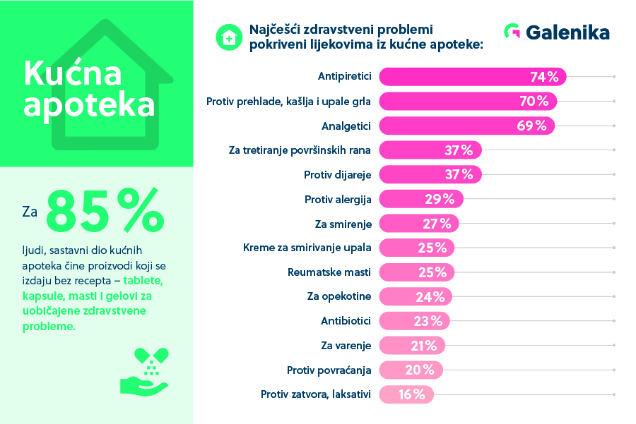 Najčešći proizvodi koje građani BiH imaju u svojim kućnim apotekama su proizvodi koji se regularno mogu izdavati bez ljekarskog recepta – tablete, kapsule, masti i gelovi za uobičajene zdravstvene probleme i bolesti, što je izjavilo 85% ispitanika istraživanja koje je sprovela kompanija Galenika. Vrste lijekova koje građani imaju u svojim kućnim apotekama, bez obzira da li podpadaju pod one koji se regularno izdaju na recept ili ne, najčešće su antipiretici tj. lijekovi za snižavanje povišene temperature (74%), te za prehladu, kašalj ili bolno grlo (70%). 69% ispitanika uvijek pri ruci ima analgetike, a kućne apoteke BiH građana sadrže i proizvode za površinsku obradu rana (37%), a isto toliko ispitanika (37%) posjeduje preparate za gastrointestinalne probleme i dijareju. Antialergijski proizvodi pokazuju globalni rast u upotrebi, a u BiH 29% populacije ističe da njihove kućne apoteke sadrže ove lijekove.