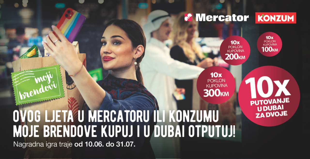 U sklopu projekta „Moji brendovi, naše vrijednosti“ Mercator i Konzum će nagraditi 10 najsretnijih kupaca sedmodnevnim putovanjem za dvoje u Dubai. Radi se o velikoj nagradnoj igri „Ovog ljeta u Mercatoru ili Konzumu Moje brendove kupuj i u Dubai otputuj!“ koja će trajati u periodu od 10.juna do 31.jula, a pravo učešća imaju svi kupci Mercatora i Konzuma koji kupe bar jedan proizvod sa oznakom Moji brendovi i kod sa dna računa pošalju na SMS broj 091 212 414. Nagradni fond osim 10 putovanja u Dubai obuhvata i po 10 vrijednih poklon kupovina u vrijednosti 100KM, 200KM i 300KM koje će sretni dobitnici realizovati u Mercator ili Konzum prodavnicama.