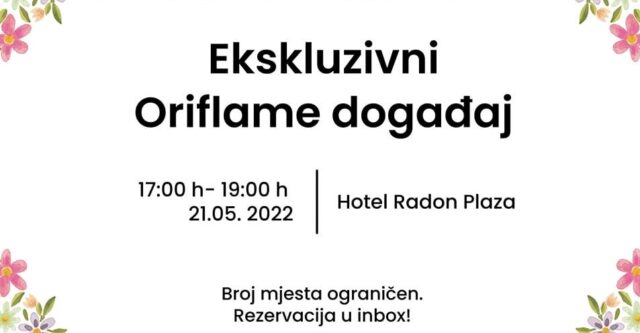 Organizatori događaja z Oriflame poručuju: “Nakon popunjavanja, prijave će biti obustavljene. Ukoliko se prijavite, a budete spriječeni molim Vas da otkažete dolazak, kako bi mjesto ustupili nekome drugom!”