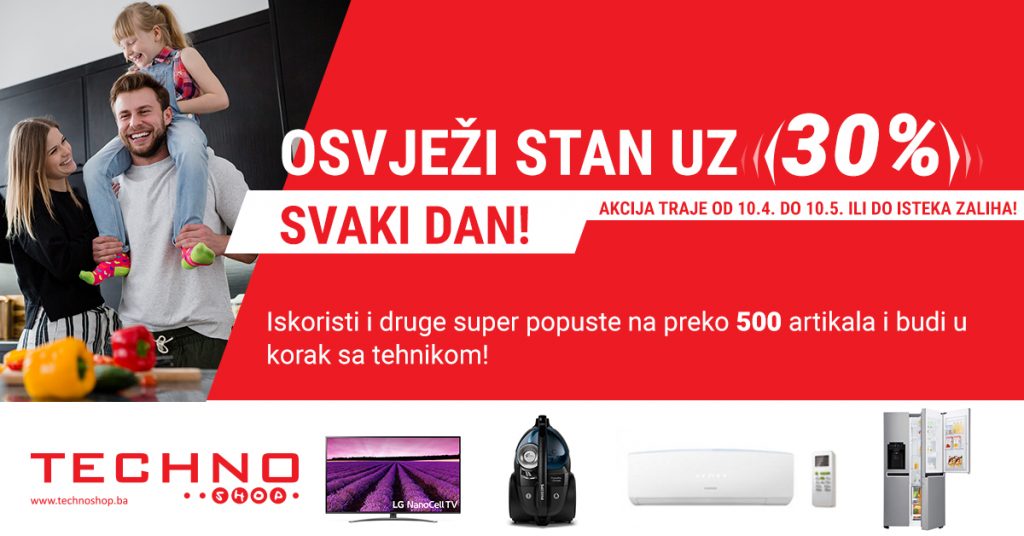 Danas nam je pažnju privukla interesantna akcija jednog od vodećih maloprodajnih lanaca tehnike u Bosni i Hercegovini, Techno Shop. Akcija zanimljivog naziva “Osvježi stan 30% svaki dan!” nas je zaintrigirala da pogledamo detaljnije. Iskreno smo se iznenadili jer smo u ponudi našli artikle snižene čak i do 46%, a u ponudi smo pronašli širok dijapazon uređaja, od usisivača i trimera do frižidera, klime i televizora. Stoga danas vam predlažemo ako planirate kupovati tehniku, da posjetite najbliži otvoreni Techno Shop ili naručite željeni komad tehnike iz topline svoga doma! Detalje ponude pogledajte ovdje.