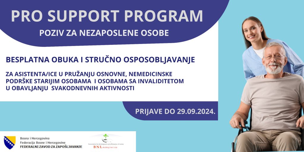 Udruženje za razvoj i afirmaciju društva Building New Lives u saradnji sa Federalnim zavodom za zapošljavanje poziva nezaposlene osobe da se prijave na PRO SUPPORT PROGRAM.