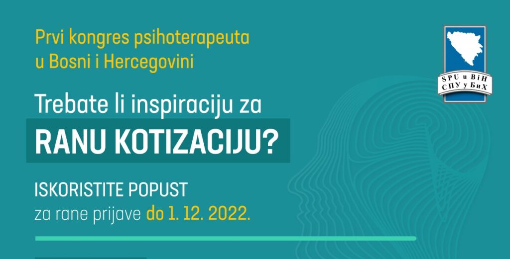 Do 1. 12. 2022. godine u ponudi su kotizacije sa popustom za rane prijave pa se mjesto na Prvom kongresu psihoterapeuta u Bosni i Hercegovini može osigurati već sada. Više informacija na: https://kongres.spubih.com/kotizacija/.