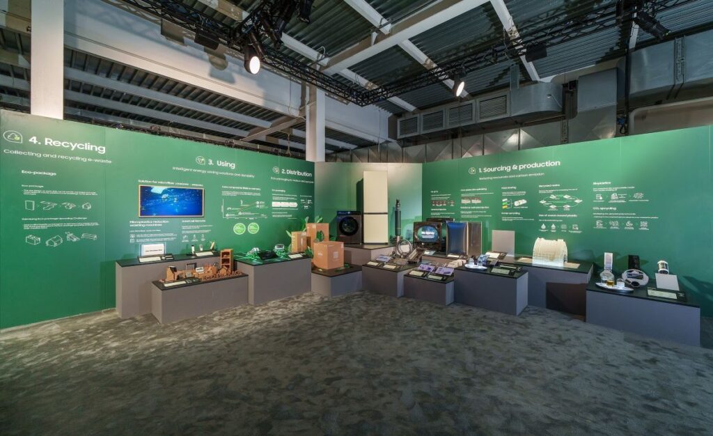 Everyday Sustainability” izložba ističe težnje kompanije Samsung u podržavanju održivosti kroz cjelokupni životni ciklus proizvoda. Od proizvodnje i distribucije do upotrebe i odlaganja, Samsung nastavlja jačati ekološku osviještenost u svakom aspektu svog poslovanja. To uključuje smanjenje upotrebe resursa i emisije ugljika[3] tokom procesa nabavke, osmišljavanja eko pakovanja za distribuciju pa sve do implementacije inovativne tehnologije za uštedu energije tokom faze korištenja, olakšavajući korisnicima recikliranje uređaja nakon što njihov životni ciklus završi.