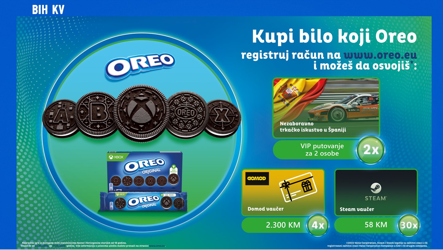 Tu zabava ne prestaje! Kupovinom bilo kojeg pakovanja OREO keksa (uključujući i standardna pakovanja) i registrovanjem računa na sajtu www.oreo.eu, potrošači u periodu od 1. do 31. marta 2023. godine dobijaju mogućnost da osvoje neku od nevjerovatnih nagrada. Nagrade za potrošače u Bosni i Hercegovini su: Dva VIP putovanja za dvije osobe uz nezaboravno trkačko iskustvo u Barceloni, četiri Domod vaučera u pojedinačnoj vrijednosti od 2.300 KM i 30 Steam vaučera u pojedinačnoj vrijednosti od 58 KM.