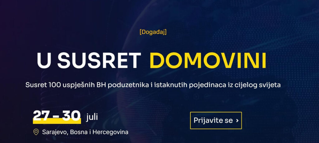 Sarajevska regionalna razvojna agencija SERDA i Evropska poduzetnička mreža u Bosni i Hercegovini (EEN), u saradnji sa Fondacijom poduzetnika u Bosni i Hercegovini, te brojnim međunarodnim organizacijama i agencijama za podršku razvoja poduzetništva, organizuju b2b poslovne susrete u okviru manifestacije „U susret domovini 2024“ koja će se održati u Sarajevu u periodu 24.07. – 27.07.2024.god.